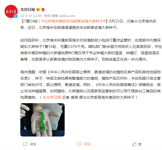 9月15日,记者从北京海关获悉,近日,北京海关在邮递渠道查获非法邮寄进境大麻种子。