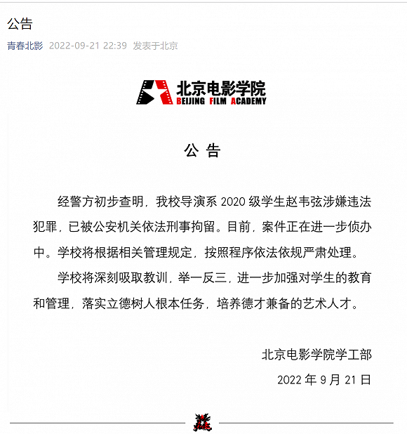 “青春北影”微信公众号9月21日消息,北京电影学院学工部发布公告称,学校将按照程序依法依规严肃处理。