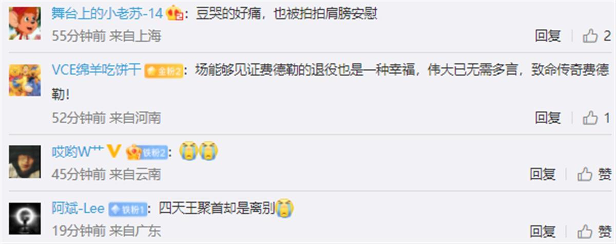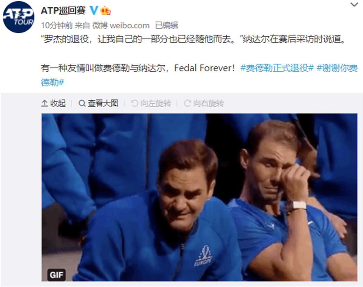 在最后一场比赛中,“费纳”组合未能获胜。赛后费德勒与队友和对手们一一拥抱。从现场的画面中可以清晰看到,纳达尔从拥抱时起就一直在抹眼泪。在费德勒的告别时刻到来时,费德勒潸然泪下,坐在他身边的纳达尔也哭得很痛心。