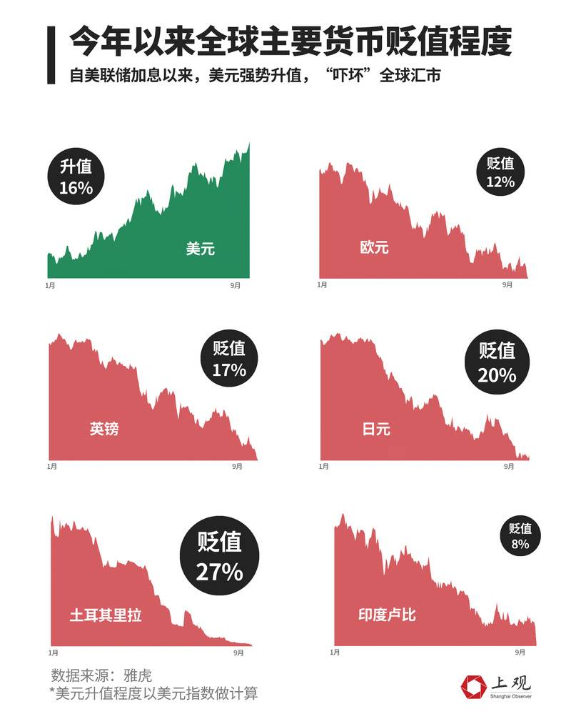 主要非美元货币里,欧元年内贬值12%,日前更一度跌破1:1平价关口,创下近20年来的最低纪录;英镑年内贬值17%,目前处于1985年以来的最低水平,法兴银行称,在英国“鸽派”加息政策下,美元兑英镑可能加速跌向1.1;日元年内贬值20%,跌至1998年以来谷底,美元兑日元向着150元关口快速迈进。