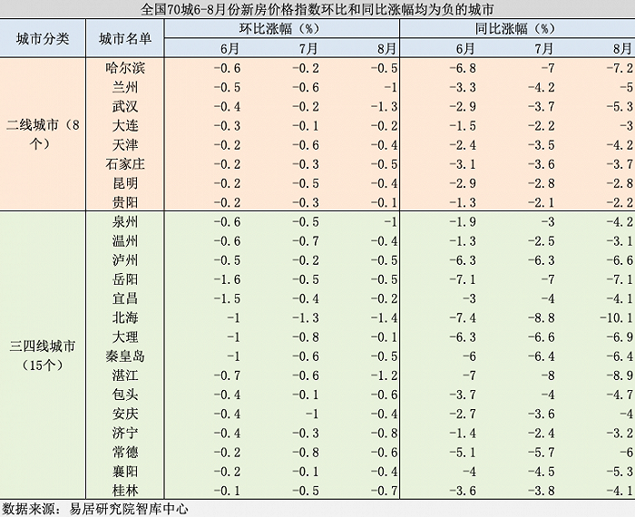 根据政策,“符合条件的城市政府”具体是指,2022年6-8月,新建商品住宅销售价格环比、同比均连续下降的城市。根据易居研究院智库中心的统计,在国家统计局发布的70个大中城市房价指数中,有23个城市符合此次新政的要求。
