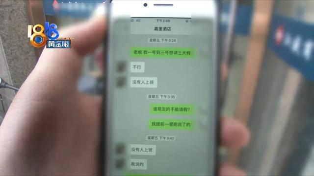 小倪之前在杭州嘉里酒店做前台。他反映,打算国庆节请三天假,结果被老板拒绝了,双方发生争执,他被老板移出了工作群。