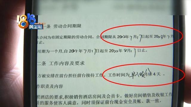 小倪表示,自己签过一份劳动合同,但是现在不在自己这边,手机里只有合同第一页的照片。图片显示,甲方是“杭州嘉里酒店”,合同期限从2022年7月17号到2023年7月17号。“工作内容及要求”写到,“工作时间为早8晚8,月休4天,接受酒店的临时工作安排和调休等”。