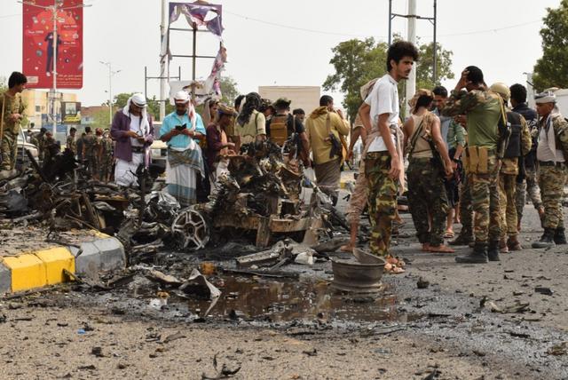 6月29日,安全人员聚集在也门亚丁的汽车炸弹袭击现场。新华社发(穆拉德·阿卜杜摄)
