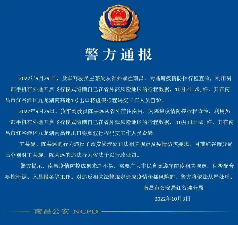 10月3日,江西省南昌市公安局红谷滩分局发布警方通报,两名货车司机为逃避疫情防控行程查验,利用另一部手机在外地开启飞行模式隐瞒自己在省外的行程数据,被警方依法予以行政处罚。