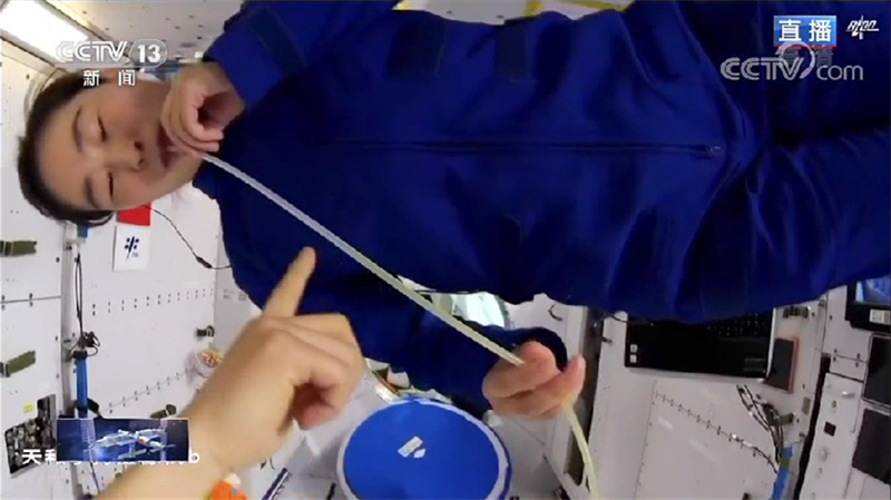 让网友们最羡慕的是喝水环节。“平时在地面,我们都是使用较短的饮水管,如果饮水管太长就比较费力。今天我准备长达两米的饮水管,看我能不能喝到?”说完,刘洋“飞檐走壁”,横躺着用两米长的管子,轻松喝到了芒果汁。她说:“地面由于重力的作用,使用饮水管喝水时液体管越高也就越费力,但空间站是微重力,仅仅依靠吮吸的力,就可以喝到两米以外饮水袋中的饮料了。”