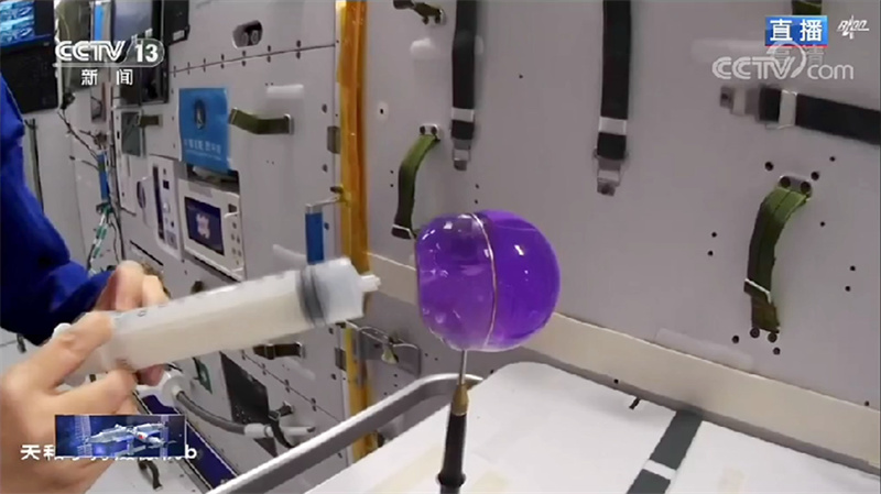 在水球变“懒”环节,刘洋往水球里加了个小钢球,神奇的一幕发生了:原本乱晃的水球就变“懒”了。