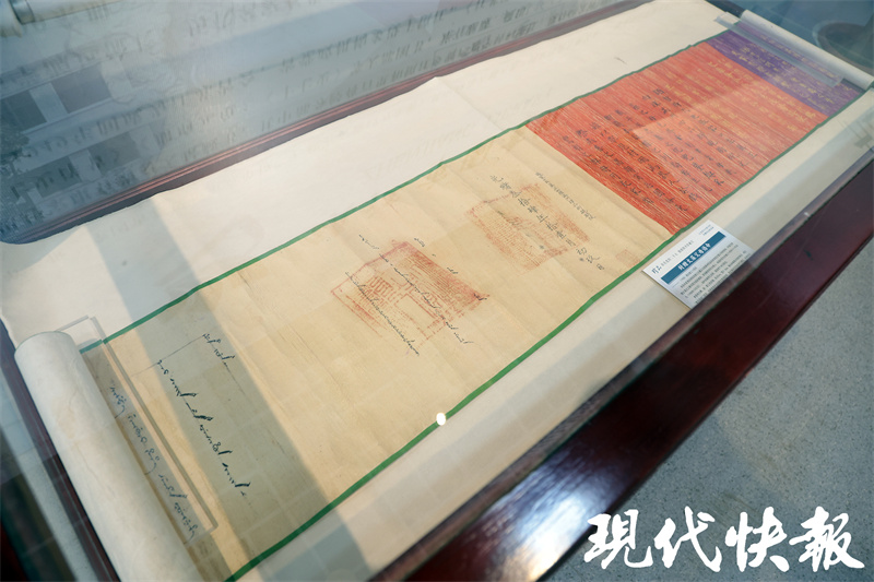 黄、赤、紫三色织锦材质,卷头和卷尾织有升龙和降龙盘绕纹样,诰文由满文、汉文两种字体书写……镇江市图书馆展出的光绪三十四年(1908)《封赠文藻父母诰命》,是清朝颁发的一道圣旨,呈现出特殊的文献形式和特有的历史感。