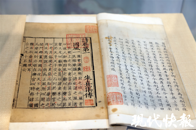 禇墨古雅、排版疏朗,穿越千年的泛黄书页衬以白纸,犹如“金镶玉”……展厅里,首先映入眼帘的就是宋刻本《诗集传》。这是宋代朱熹的《诗经》研究著作,深研《诗经》本义,兼采众说,成为元明清三代科举考试标准,影响深远。此次展出的是南宋宁宗、理宗间刻本,由南京图书馆珍藏。一页宋版,一两黄金。宋刻本古籍存世量少,因此尤为珍贵。