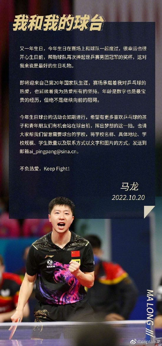 长文最后,马龙表示今年生日球台的活动会如期举行,请大家帮忙留意需要球台的学校并发送资料到指定邮箱,“希望有更多喜欢乒乓球的孩子和青年朋友们有机会站在球台前,挥出梦想的这一拍”。