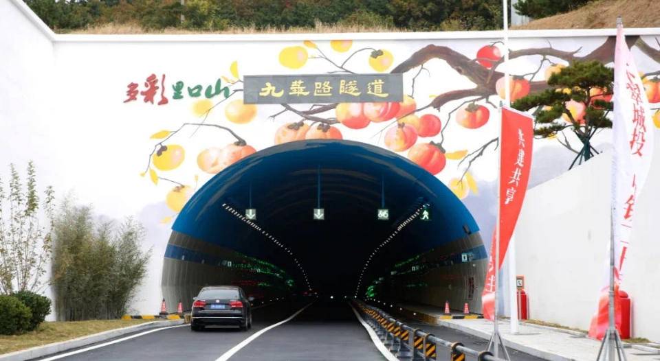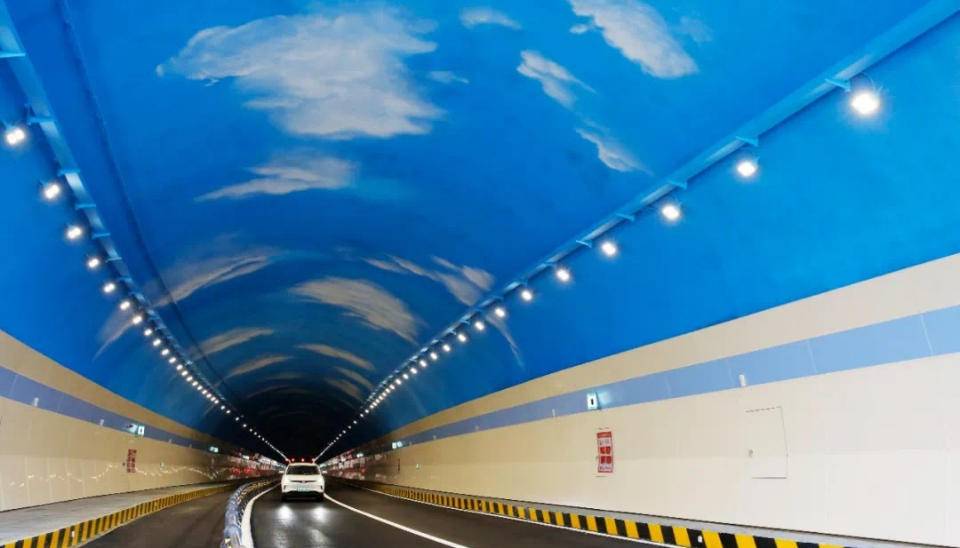 行驶在九华路隧道内,不仅照明灯光齐齐点亮,光彩熠熠一直延伸到远方,隧道顶部更是增加了蓝天白云穹顶喷图。隧道南侧端墙的多彩里口山主题彩绘也是惟妙惟肖,这处特色网红隧道凭借超高颜值和实用功能,成为精致城市又一典范工程。