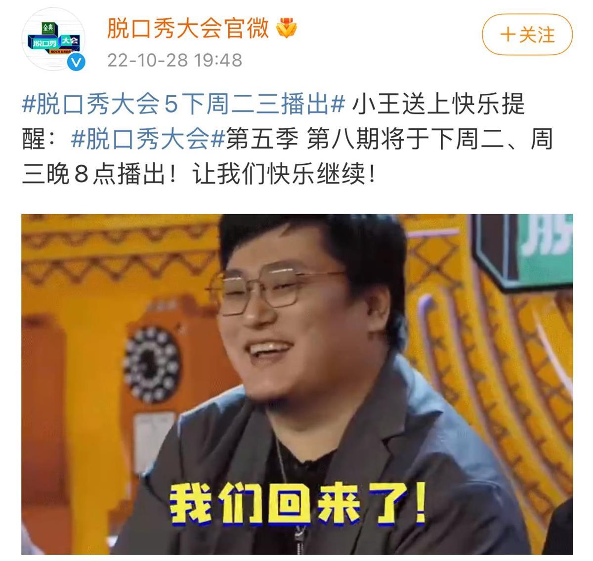 综艺节目在本周将开启回归步伐!极目新闻记者注意到,刚刚过去的周五、周六,王牌综艺节目纷纷回归,爆红节目《脱口秀大会5》也在10月28日正式宣布将于下周复播!