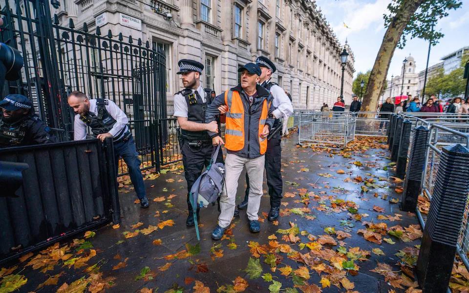 据报道,当天11时20分左右,一群抗议者试图冲击唐宁街大门,还有人将自己粘在地上。报道称,总共有22人参与了此次抗议活动。现场视频显示,多名抗议者翻过围栏试图靠近大门而被警方拦下。