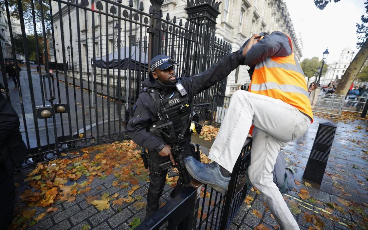 【环球网报道记者乔炳新】据英国《每日电讯报》报道,英国环保组织“JustStopOil”(停止采石油)的抗议者当地时间11月1日试图冲击英首相官邸所在的唐宁街大门,现场被警方拦下。