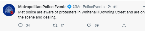 英国伦敦大都会警察局当天也在推特上回应称,“警方已经注意到白厅/唐宁街的抗议者,并在现场进行处理。”