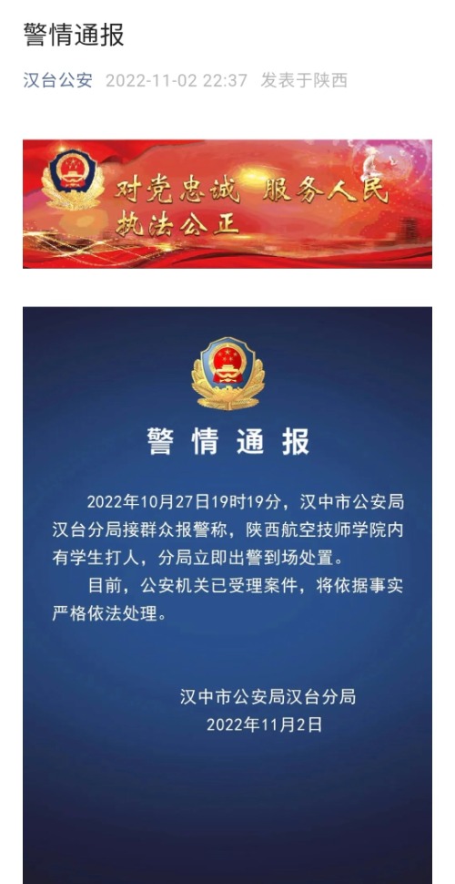陕西省汉中市公安局汉台分局11月2日晚发布警情通报称,2022年10月27日19时19分,汉中市公安局汉台分局接群众报警称,陕西航空技师学院内有学生打人,分局立即出警到场处置。目前公安机关已受理案件,将依据事实严格依法处理。