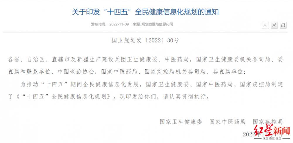 成都商报-红星新闻消息,11月9日,据国家卫健委官网信息,国家卫健委、国家中医药局、国家疾控局已联合发布《“十四五”全民健康信息化规划》(以下简称《规划》),提出到2025年,初步建设形成统一权威、互联互通的全民健康信息平台支撑保障体系,基本实现公立医疗卫生机构与全民健康信息平台联通全覆盖。