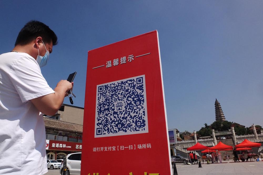 2022年7月6日,山西运城,一名居民在新绛县核酸检测点扫码进行核酸检测。图据视觉中国