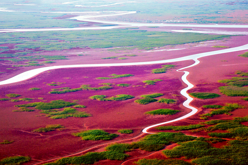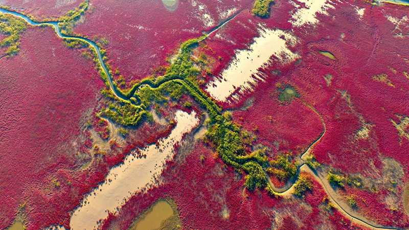 山东黄河三角洲国家级自然保护区内,翅碱蓬给滨海滩涂湿地铺上“红地毯”。新华网发(杨斌摄)
