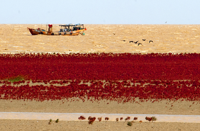 绵延不绝的翅碱蓬把广袤的滩涂染成红色,成为秋季黄河口独特的风景。新华网发(胡友文摄)