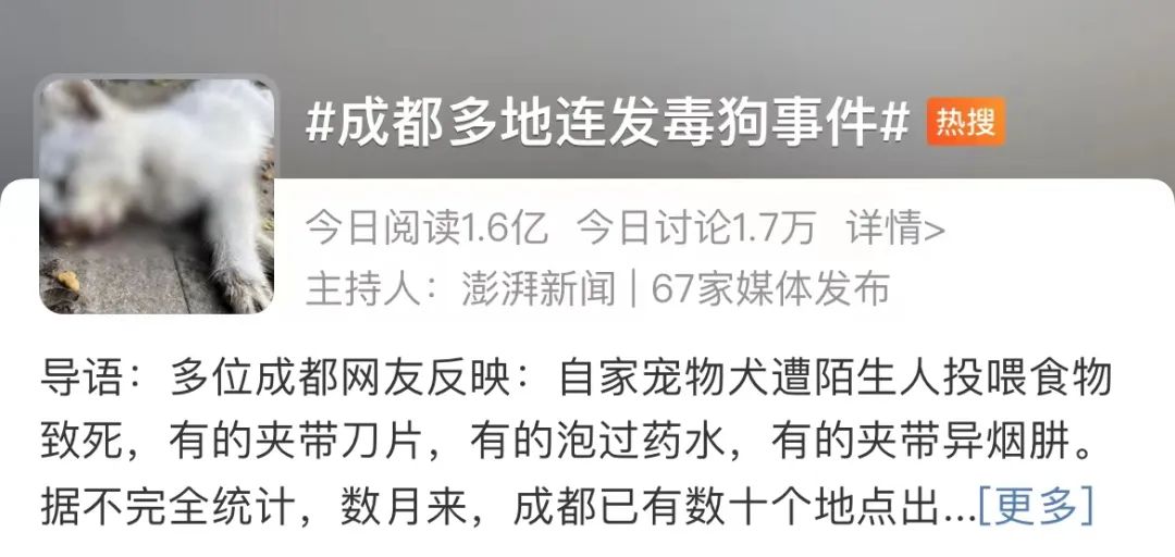 近日,多位成都网友反映,自家宠物犬遭陌生人投喂不明食物致死,引发网友关注。