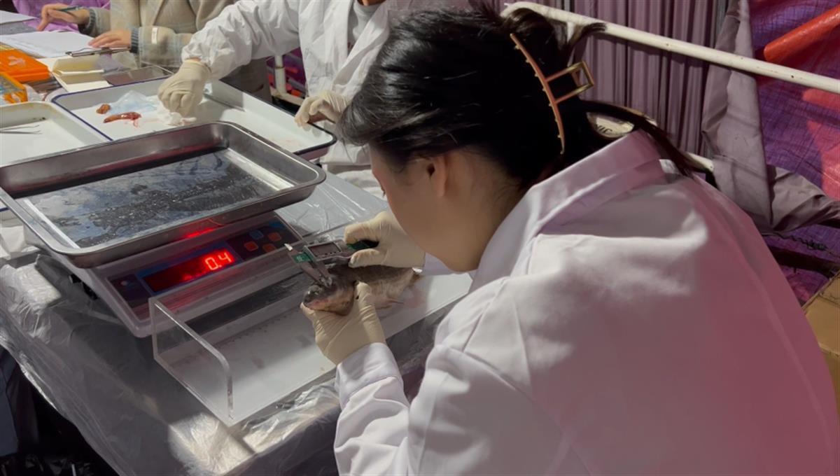 不过,并不是每一份样本都需要送到实验室采样、解剖和分析。“如果捕捞起水的鱼类中有国家珍稀保护种类,我们就在测量体长和体重之后马上放生。”根据介绍,在禁捕区域进行的科研捕捞会首先鉴定鱼的种类,而后测量体长、体重以及确定捕捞尾数,对于诸如铜鱼、四大家鱼等比较有代表性的长江鱼类,就会带到为每个监测点设置的临时实验室采集相关样本,采样后再交给渔政部门进行无害化处理。如果有需要送至水生所进行研究的鱼类,就会在当地制作标本再运回武汉。
