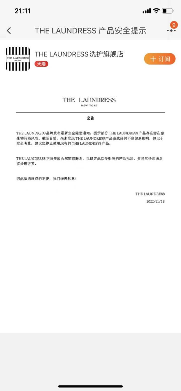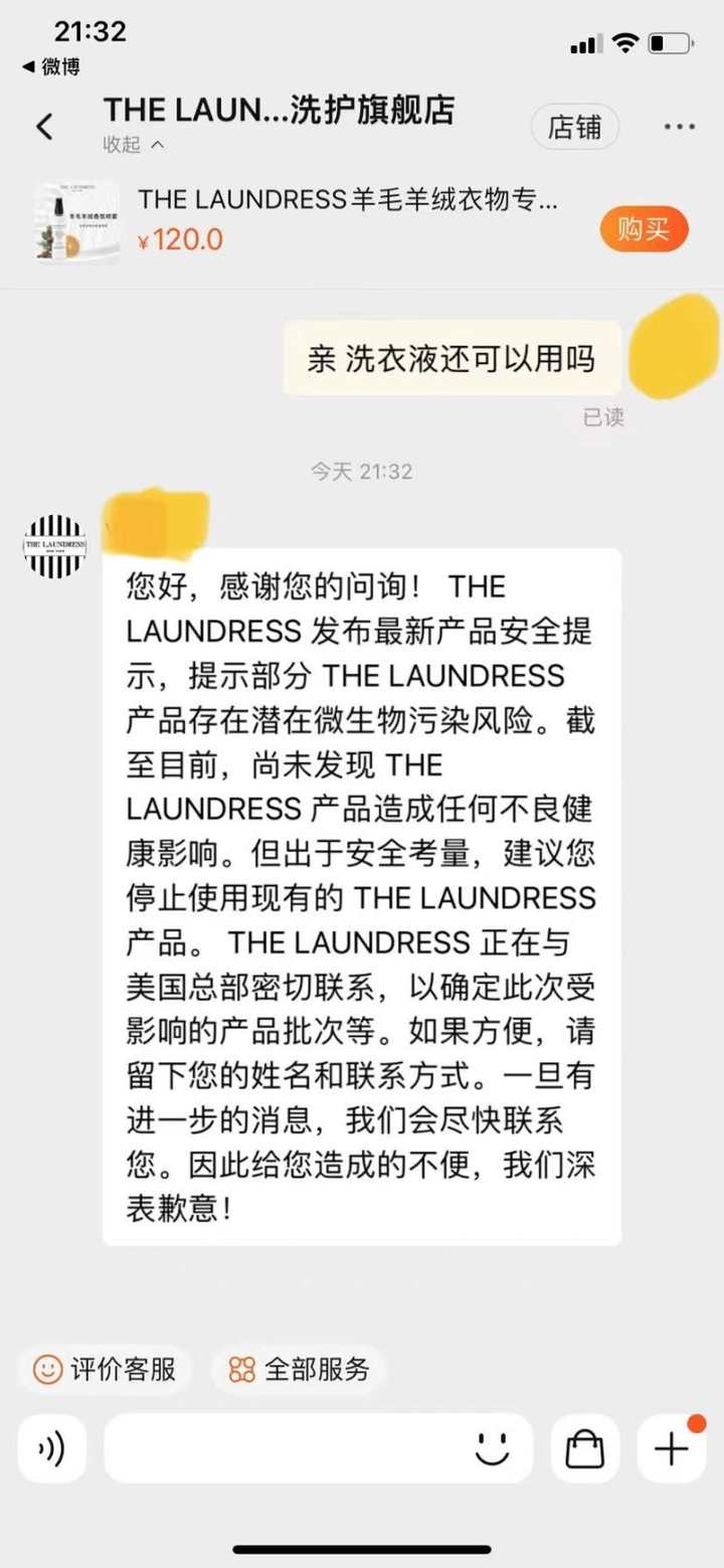 钱江晚报·小时新闻记者尝试联系了品牌客服,对方回复,“THELAUNDRESS发布最新产品安全提示,提示部分THELAUNDRESS产品存在潜在微生物污染风险。”对方提到,截至目前,尚未发现THELAUNDRESS产品造成任何不良健康影响。“但出于安全考量,建议停止使用现有的THELAUNDRESS产品。”