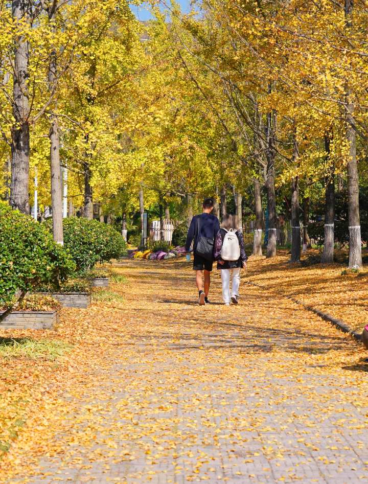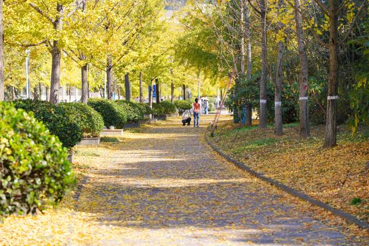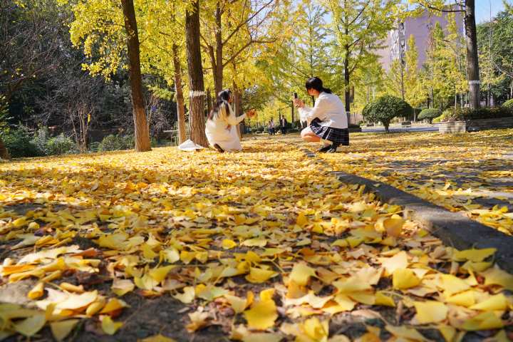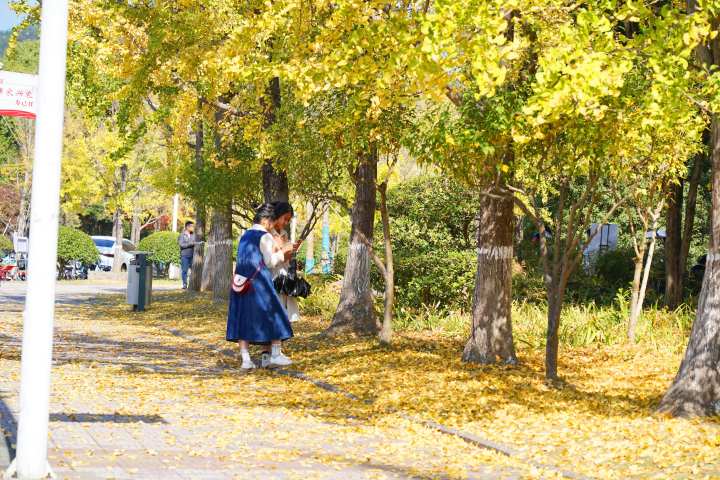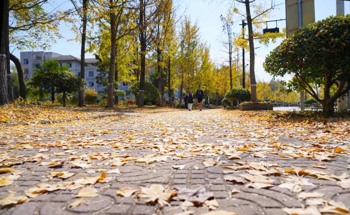 随着银杏叶整体变黄,校园开始呈现出“颜值巅峰”:层层叠叠的银杏叶铺满银杏大道,满目金黄色的银杏叶和湛蓝的天空相映成趣。