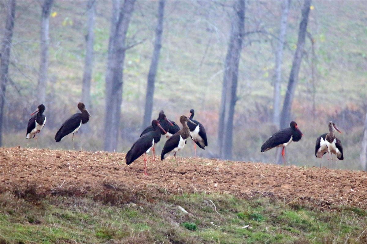 趴在茅草丛中,为16只黑鹳拍摄“全家福”