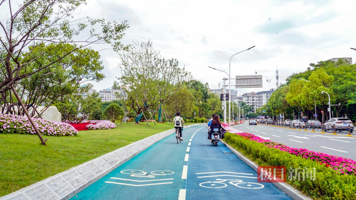三期绿道与城市交通相融,保留双向通行的机动车道,新修骑行道,拓宽人行道,从而实现了“三道”分流,互不干扰。怎么“挤”出这些空间的?将路边的法桐树穴拉通,形成绿化带,原绿化带就可让位于步行道。