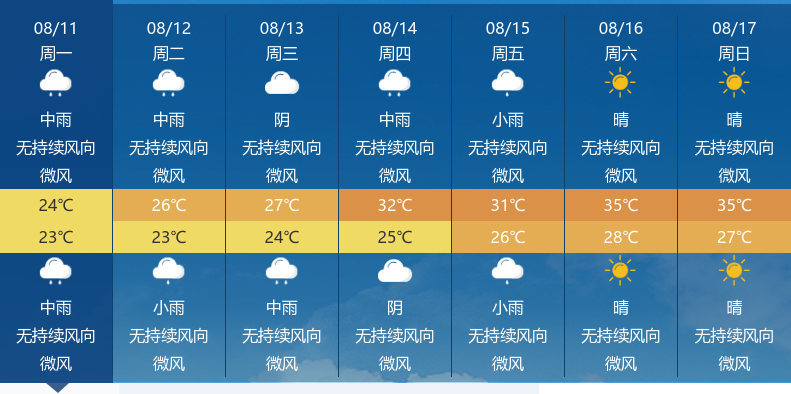 未来三天,天门将迎来持续降雨天气。其中,8月12日中雨转小雨,8月13日阴转中雨,8月14日中雨转阴,气温在24℃至32℃之间波动,风力均为微风。建议相关部门加强排水系统巡查,防范城市内涝;公众避免在低洼地带停留,确保出行安全。