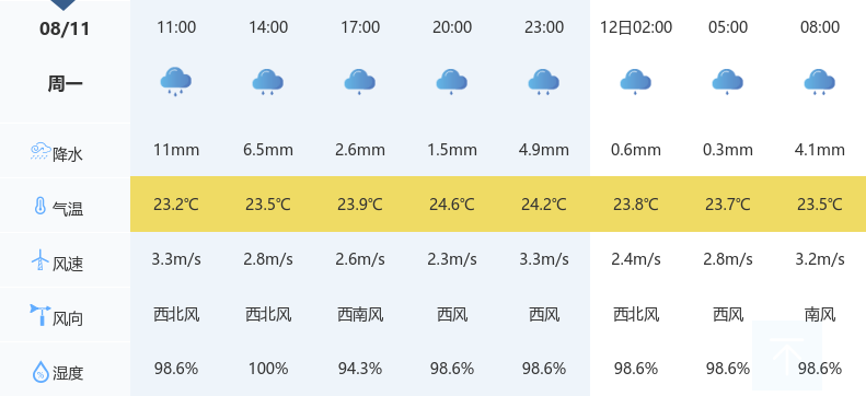 今天是2025年8月11日,天门白天天气为中雨,夜晚天气为中雨,最高气温24℃,最低气温23℃,微风,空气湿度100%,体感温度28.5℃,空气质量优。建议市民外出携带雨具,注意防雨防滑,避免因湿度过高引发身体不适。