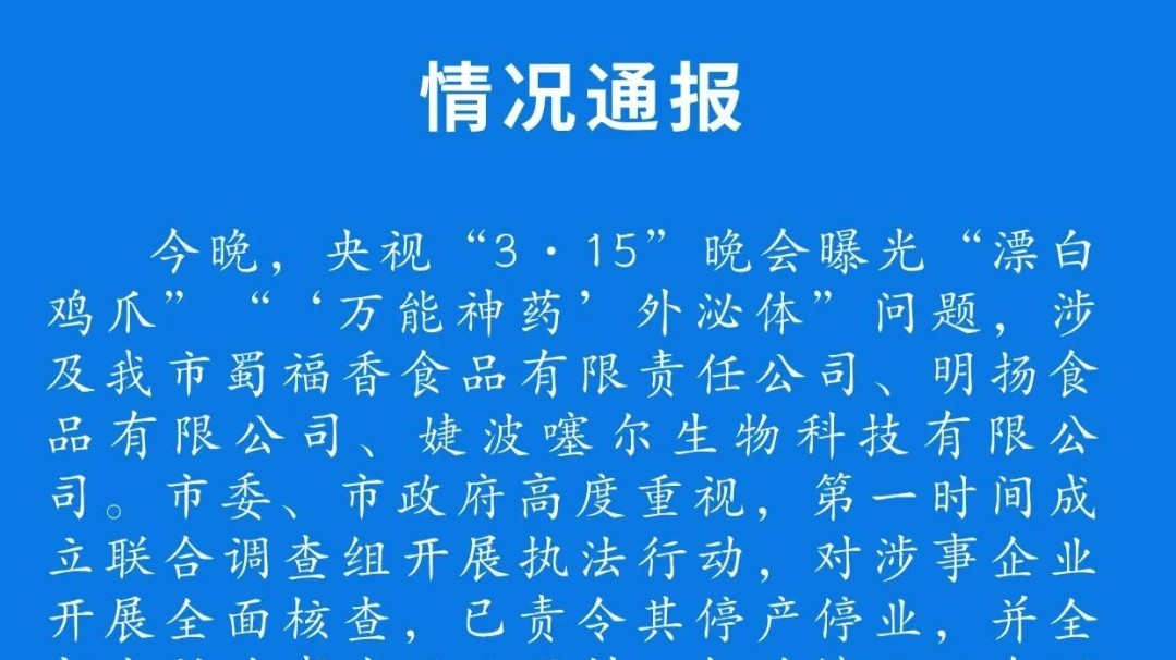 成都通报漂白鸡爪和“万能神药”外泌体相关情况:对涉事企业开展全面核查,已责令其停产停业,并全部查封涉事产品及原料成都市市场监管局 昨日