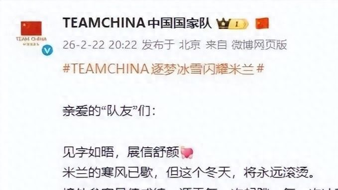 中国国家队发布冬奥收官文:感谢每一位把名字刻进米兰冰雪的运动员@TEAMCHINA中国国家队 昨日
