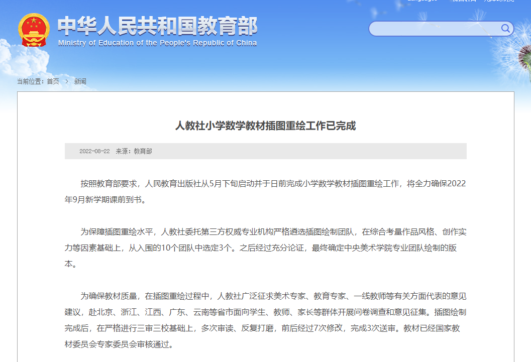 此前,人民教育出版社(简称人教社)第十一套小学数学教材插图问题受到社会广泛关注。教育部网站同日发布关于人民教育出版社小学数学教材插图问题的调查处理通报指出,第十一套小学数学教材插图主要存在三方面问题:一是不美观向上,与立德树人根本要求存在差距;二是不严肃规范,个别插图甚至存在错误;三是不细致准确,部分插图容易引人误读。