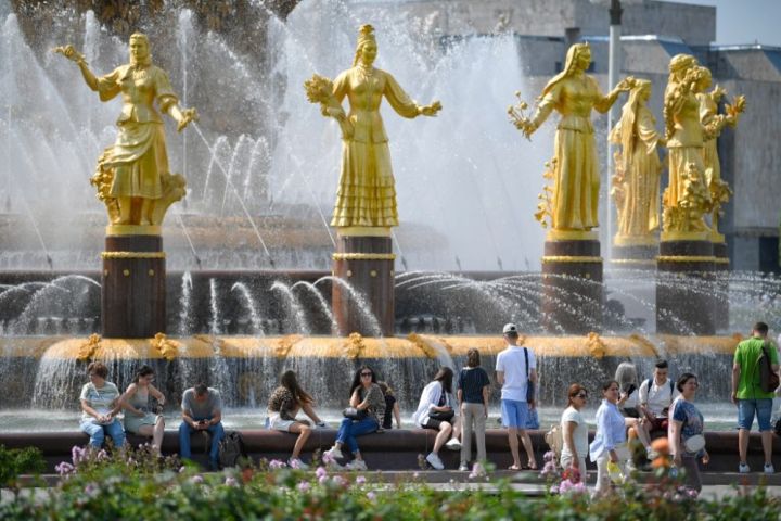 7月27日,在俄罗斯首都莫斯科,人们在国民经济成就展览馆的喷泉旁消暑。新华社发(亚历山大摄)