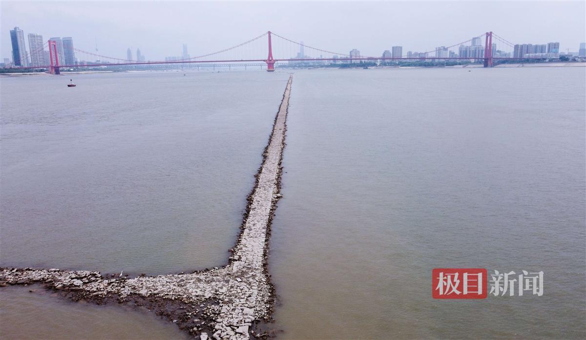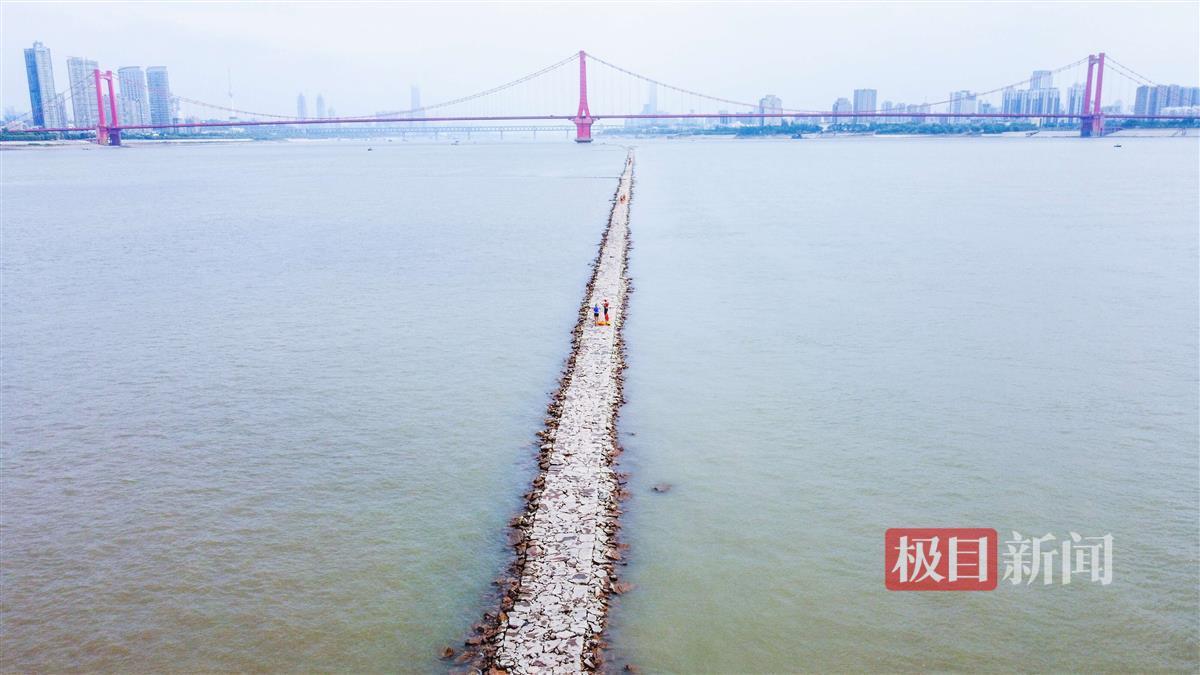 极目新闻记者从相关部门了解到,这条江心的“大路”其实学名叫顺坝,作用是保护航道和跨江桥梁的桥墩,是与鹦鹉洲长江大桥同步修建的,全长约为3.2公里。与之垂直的,还有5条“鱼骨坝”,长70至130米不等。