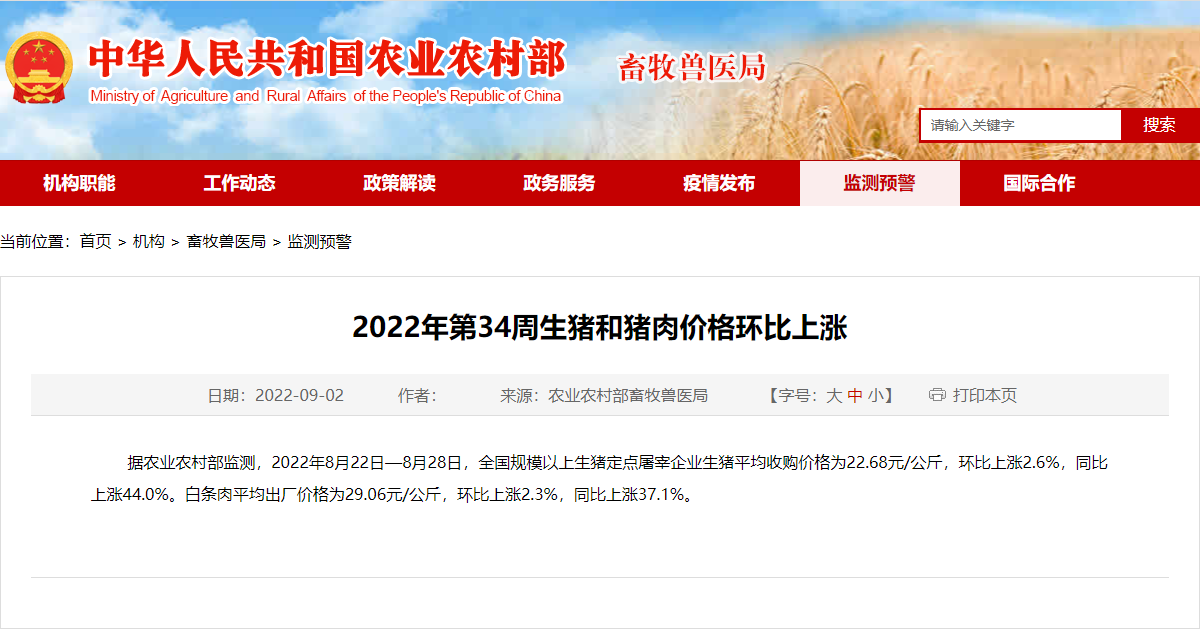 据农业农村部监测,2022年8月22日-8月28日,全国规模以上生猪定点屠宰企业生猪平均收购价格为22.68元/公斤,环比上涨2.6%,同比上涨44.0%。白条肉平均出厂价格为29.06元/公斤,环比上涨2.3%,同比上涨37.1%。