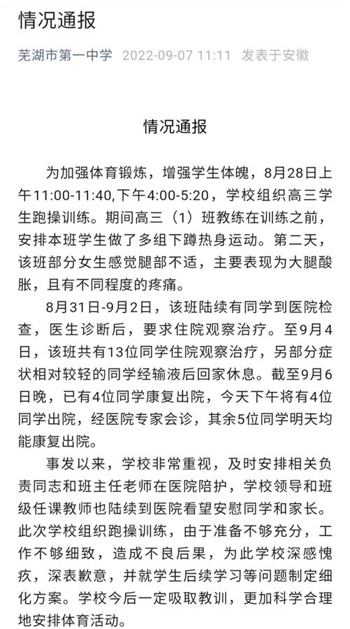9月7日,安徽省芜湖市第一中学(以下简称“芜湖一中”)发布通报称,学校在组织跑操训练后导致13位同学住院观察治疗,部分同学输液后回家休息,对此深表歉意。