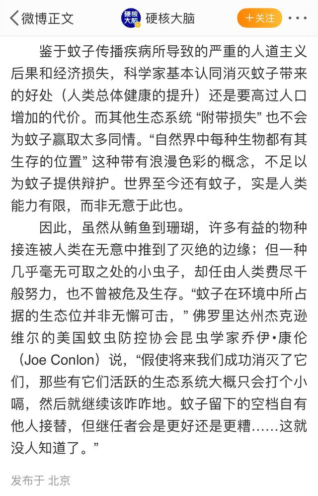 据了解,顶尖学术期刊《自然》曾就“这世界上没有蚊子会怎样?”向一些研究蚊虫生物学及生态学的专家进行询问,得到的答案是:科学家基本认同消灭蚊子带来的好处(人类总体健康的提升),而世界至今还有蚊子,实是人类能力有限,而非无意于此。