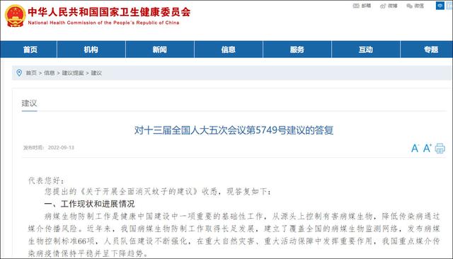 9月13日,国家卫健委针对十三届全国人大五次会议第5749号《关于开展全面消灭蚊子的建议》作出答复。答复称,病媒生物防制工作是健康中国建设中一项重要的基础性工作,从源头上控制有害病媒生物,降低传染病通过媒介传播风险。