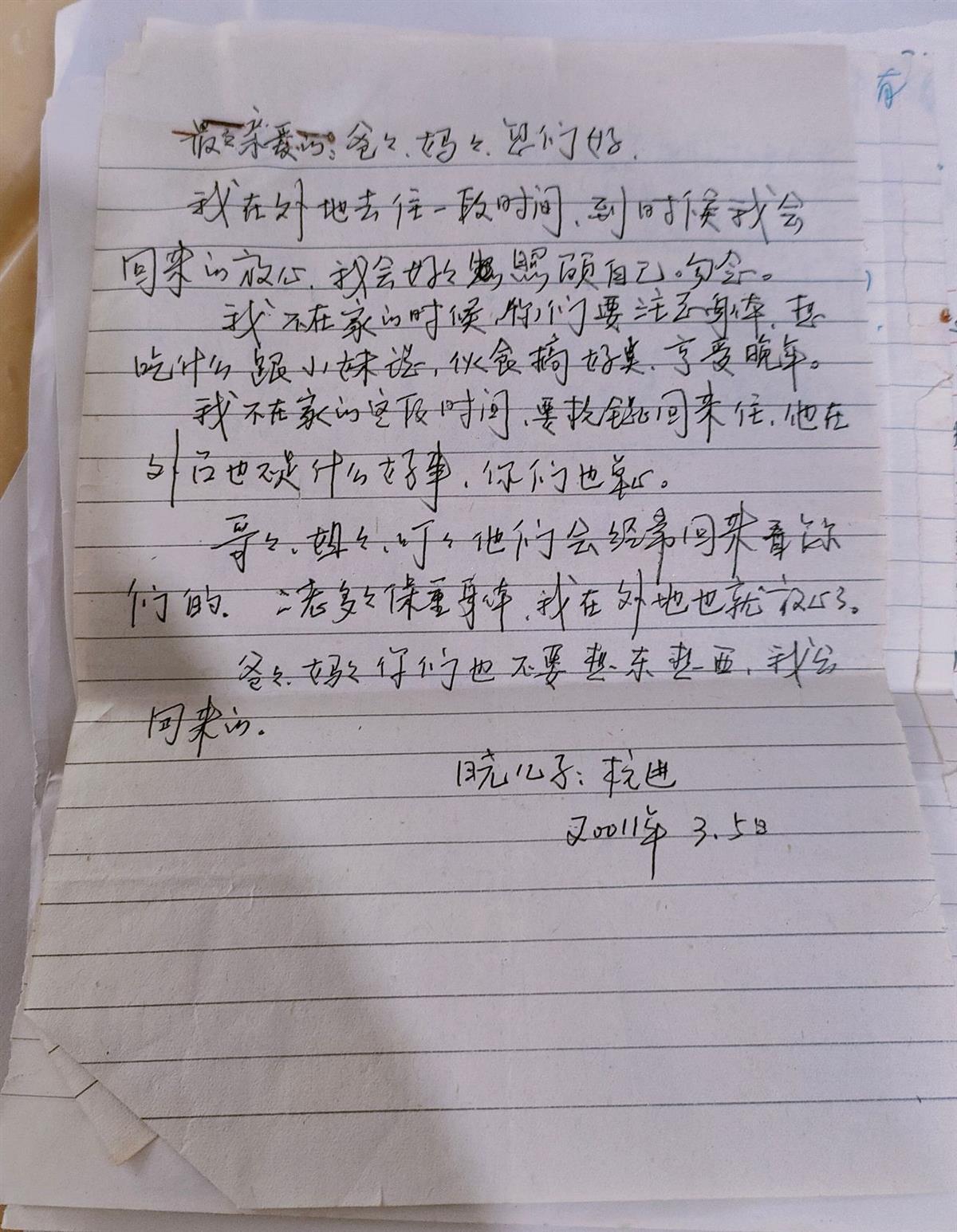 信中,杭进写道,希望父母能够照顾好自己,不必担心他,他只是去外地住一段时间,会回来的。然而,他出门的时候身份证、银行卡和钥匙等物品全部都没有拿上,直到11年后的今天,他仍然没能回到父母身边。