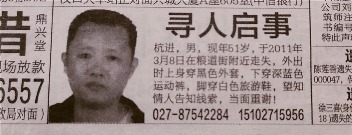 由于杭进出走时没有带身份证也没带钱,没有办法正常生活下去,杭锟前往武汉市各个收容所去寻找,但最终还是无功而返。2013年的时候,他还曾在楚天都市报上发布过寻人启事,也没收到任何有效的线索。