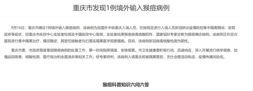重庆市卫健委通报,2022年9月16日重庆市确诊1例境外输入猴痘病例。同时,重庆卫健委对什么是猴痘、猴痘的临床表现、传播途径、预防治疗进行了解答。