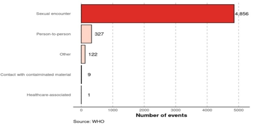 按传播方式分类的猴痘病例。在报告的病例中,其中97%(7541/7741)确定为同性恋、双性恋和其他男男性行为者。23%(5315/23290)的病例有传播方式的数据,其中91%(4856/5315)报告通过性接触传播。(截至2022年8月7日,图片来源WHO)。