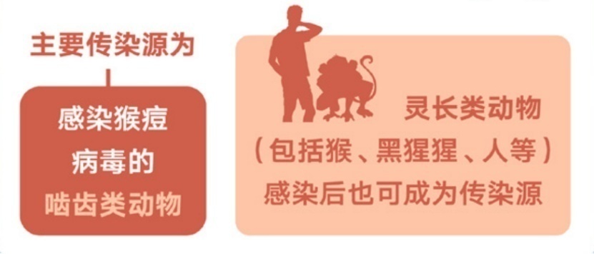 猴痘的主要传染源为感染猴痘病毒的啮齿类动物。灵长类动物(包括猴、黑猩猩、人等)感染后也可成为传染源。