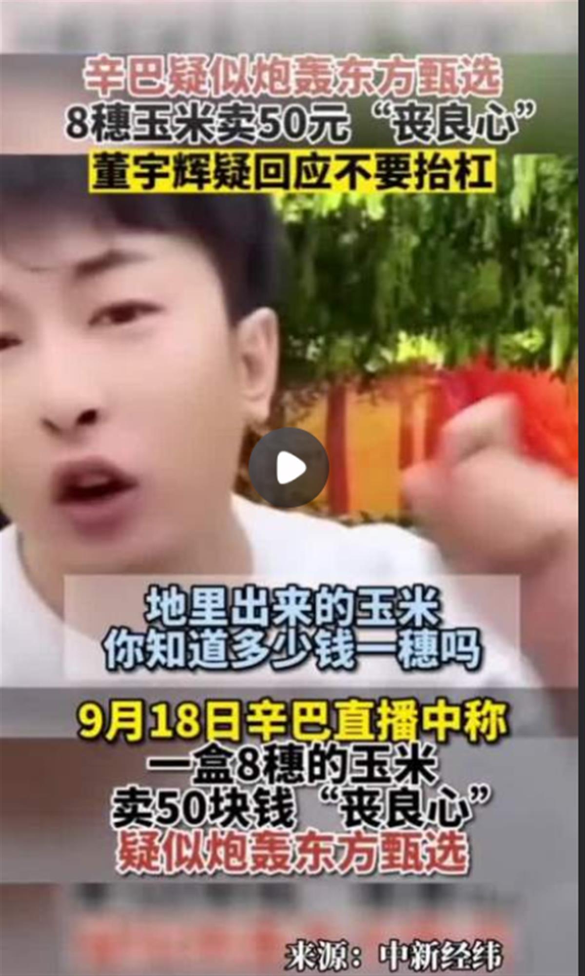 9月18日,辛巴在直播间中表示,某些直播间卖高价产品还标榜谷贱伤农,这纯属是在欺骗老百姓。对于辛巴的质疑,东方甄选主播董宇辉解释称,东方甄选玉米跟普通玉米不一样,大部分玉米不是用来人吃的,4、5毛钱一穗的玉米是用来养牲口的。(据9月20日《证券时报》)