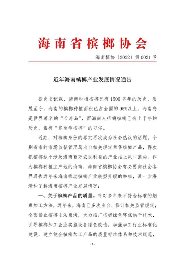 在此前提下,9月21日,我国“槟榔大省”海南省的槟榔协会发布通告,对近年来海南槟榔产业发展情况做进一步澄清和解释。9月22日,记者发现,该通告已被删除。