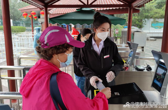 10月3日,玉渊潭公园职工做好门区查验72小时内核酸检测阴性证明、扫码测温及园内巡视引导等工作。北京市玉渊潭公园微博图