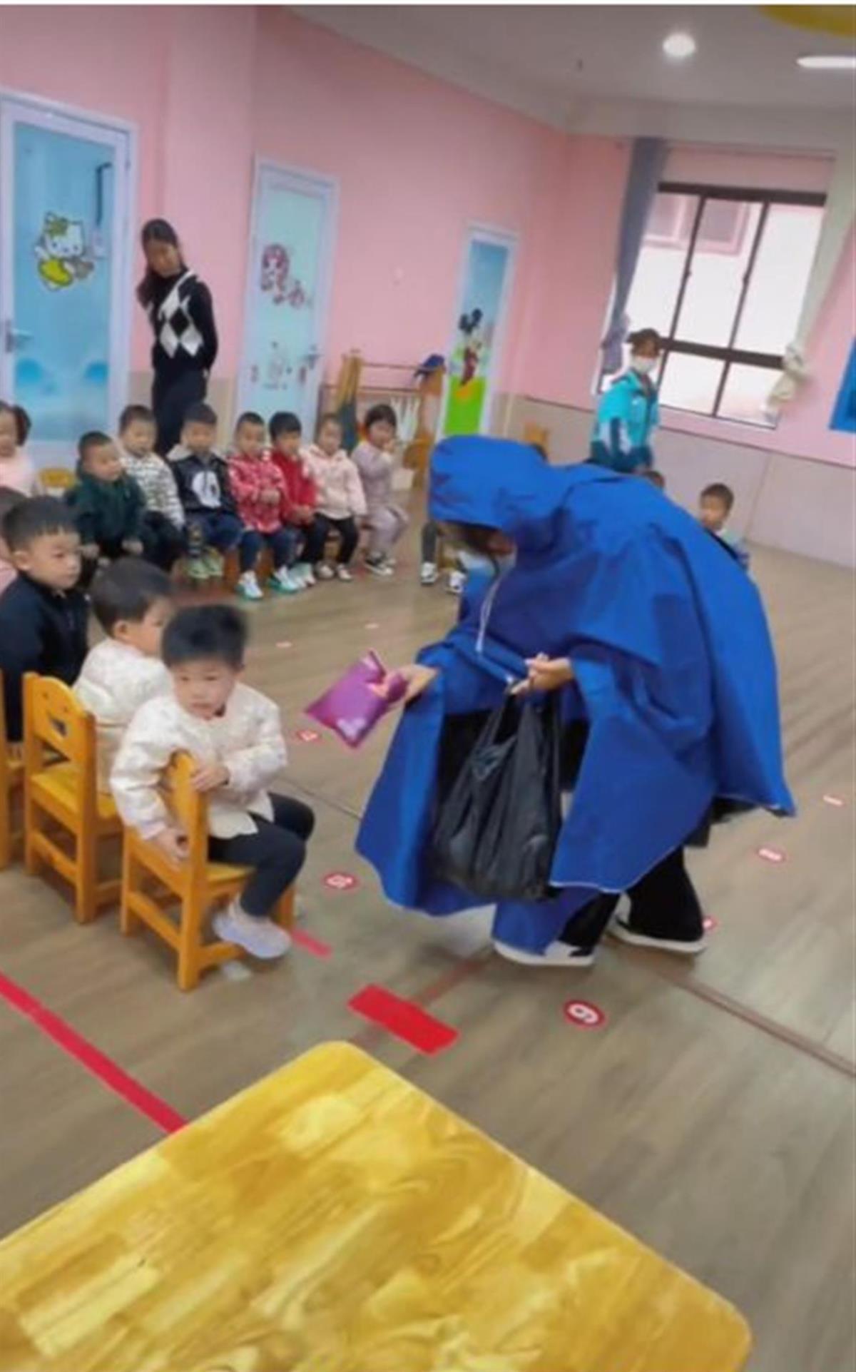 一段现场视频显示,一所幼儿园内,一名披着外套、戴着墨镜的“坏人”提着一个袋子,走进一间教室;“坏人”拿出一袋食物递给第一个小朋友,遭到拒绝,她随即将食物递给第二个小朋友,这个小朋友收下食物后被其抱出了教室;“坏人”随后又用食物和玩具逐个试探其他小朋友,剩下的所有小朋友都不敢再接受其食物和玩具,一个小朋友甚至被吓哭。
